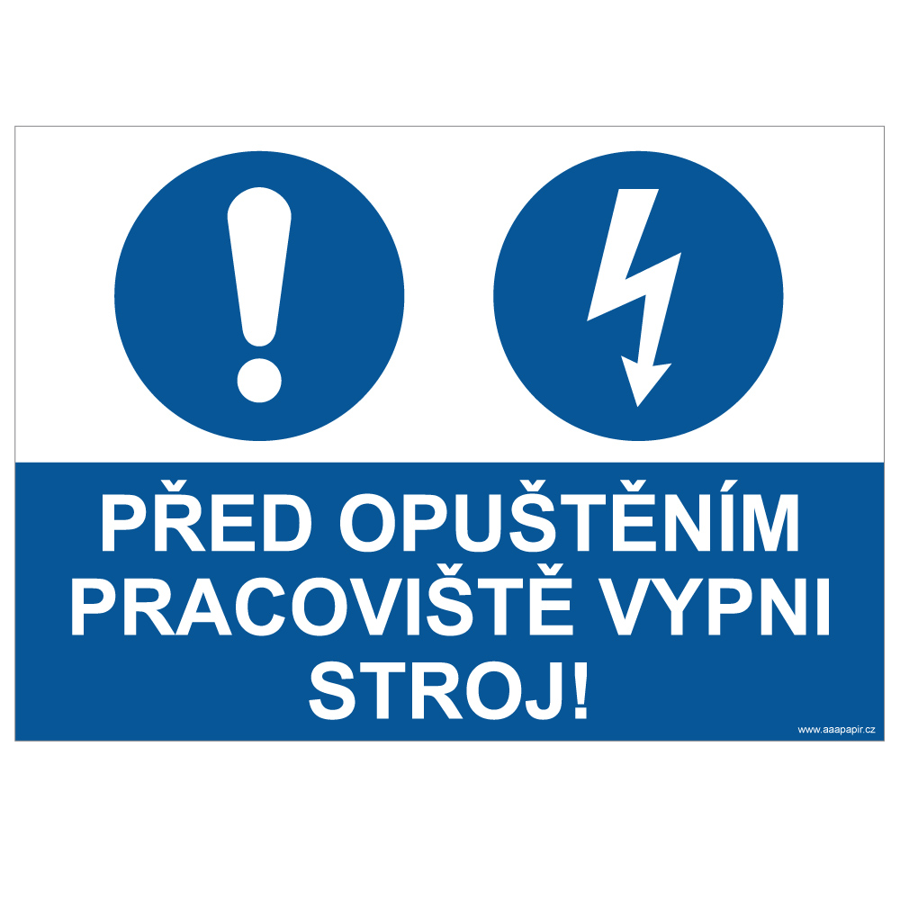PŘED OPUŠTĚNÍM PRACOVIŠTĚ VYPNI STROJ - bezpečnostní tabulka, samolepka A4