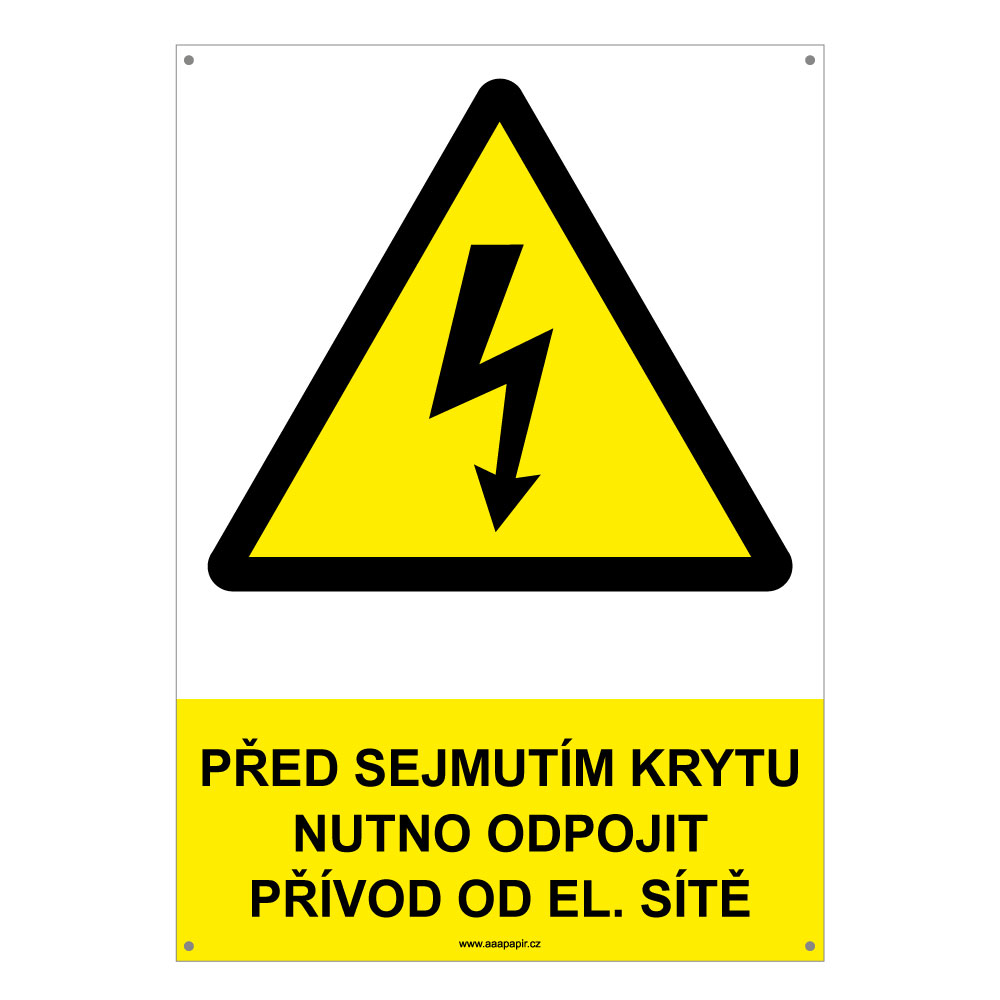 PŘED SEJMUTÍM KRYTU NUTNO ODPOJIT PŘÍVOD OD EL. SÍTĚ - bezpečnostní tabulka, samolepka A4
