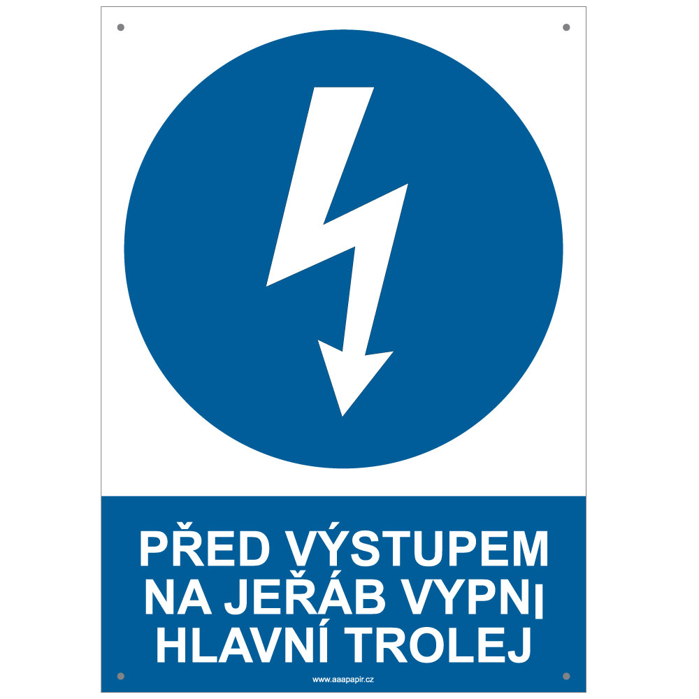 PŘED VÝSTUPEM NA JEŘÁB VYPNI HLAVNÍ TROLEJ - bezpečnostní tabulka s dírkami, plast A4, 2 mm