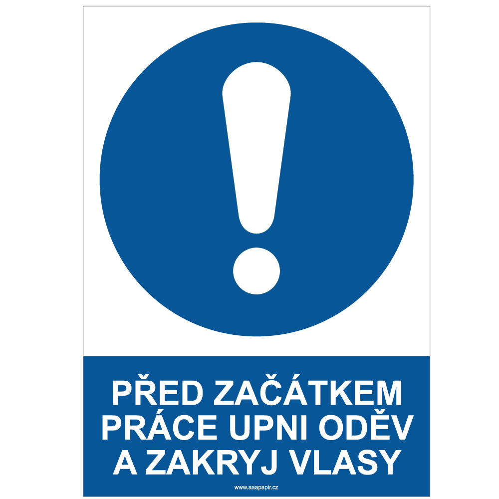 PŘED ZAČÁTKEM PRÁCE UPNI ODĚV A ZAKRYJ VLASY - bezpečnostní tabulka, samolepka A4