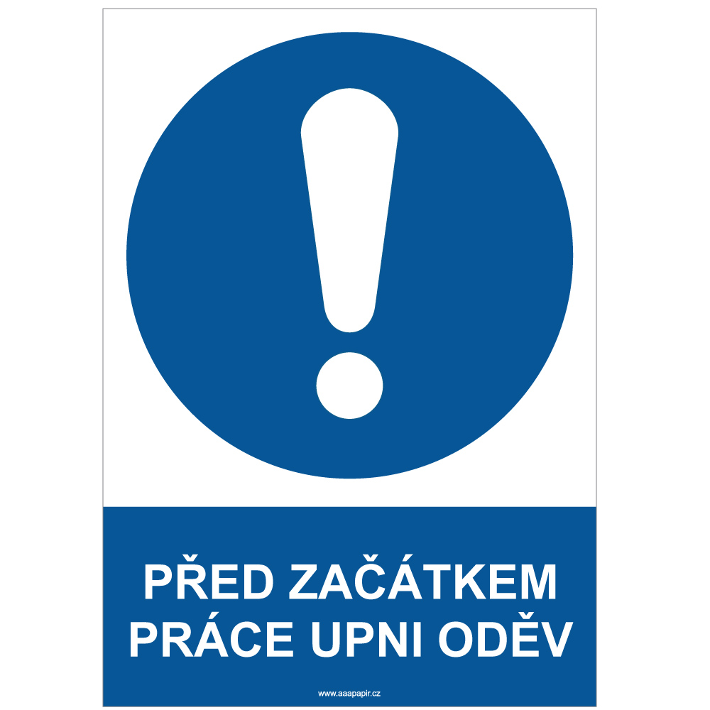 PŘED ZAČÁTKEM PRÁCE UPNI ODĚV - bezpečnostní tabulka, plast A4, 2 mm