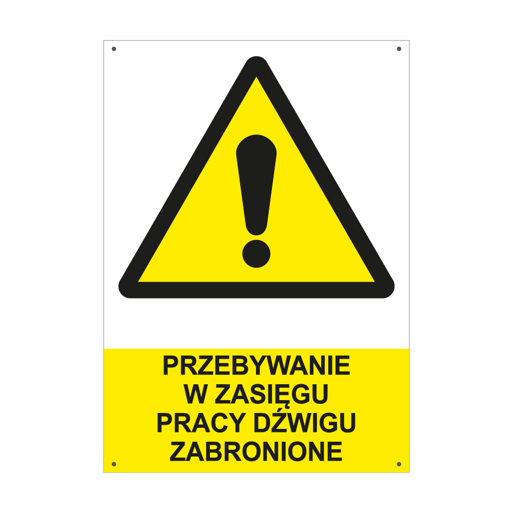 PRZEBYWANIE W ZASIĘGU PRACY DŹWIGU ZABRONIONE - znak BHP z dziurkami, płyta PVC A4, 2 mm