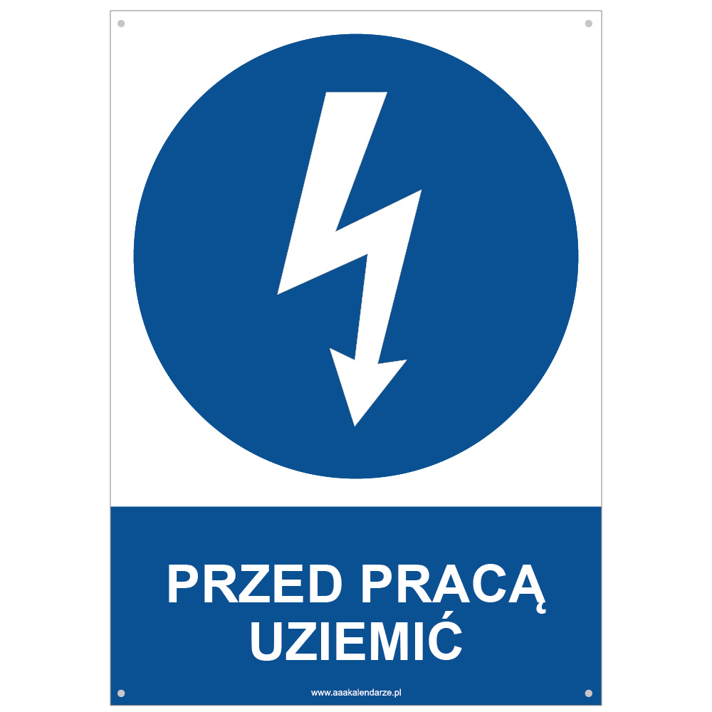 PRZED PRACĄ UZIEMIĆ - znak BHP z dziurkami, płyta PVC A4, 2 mm