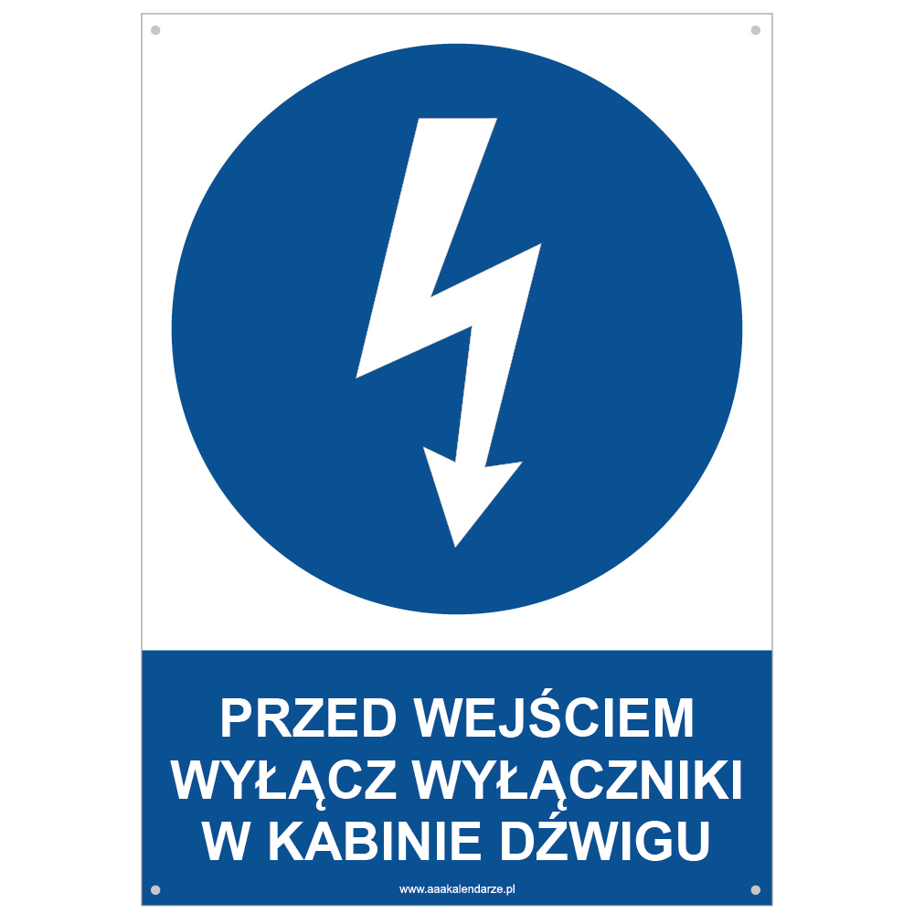 PRZED WEJŚCIEM WYŁĄCZ WYŁĄCZNIKI W KABINIE DŹWIGU - znak BHP z dziurkami, płyta PVC A4, 2 mm