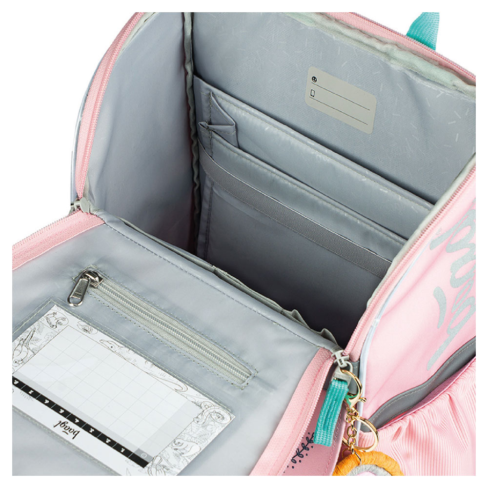 • Vnútri aktovky je priehľadná kapsa s rozvrhom a vnútorný organizér umožňujúci rovnomerné rozloženie hmotnosti doplnený gumičkou kvôli fixácii.