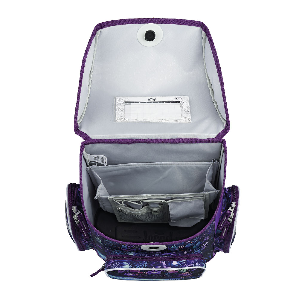 • Vnútri aktovky je priehľadné vrecko na rozvrh a vnútorný organizér umožňujúci rovnomerné rozloženie hmotnosti.