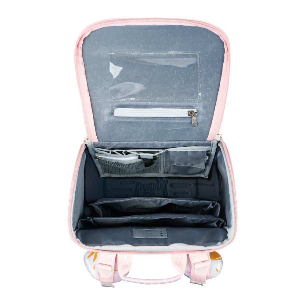 • Vnútri aktovky je priehľadná kapsa s rozvrhom a vnútorný organizér umožňujúci rovnomerné rozloženie hmotnosti doplnený gumičkou kvôli fixácii.