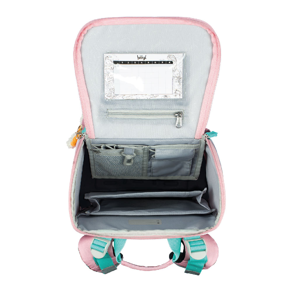 • Vnútri aktovky je priehľadná kapsa s rozvrhom a vnútorný organizér umožňujúci rovnomerné rozloženie hmotnosti doplnený gumičkou kvôli fixácii.