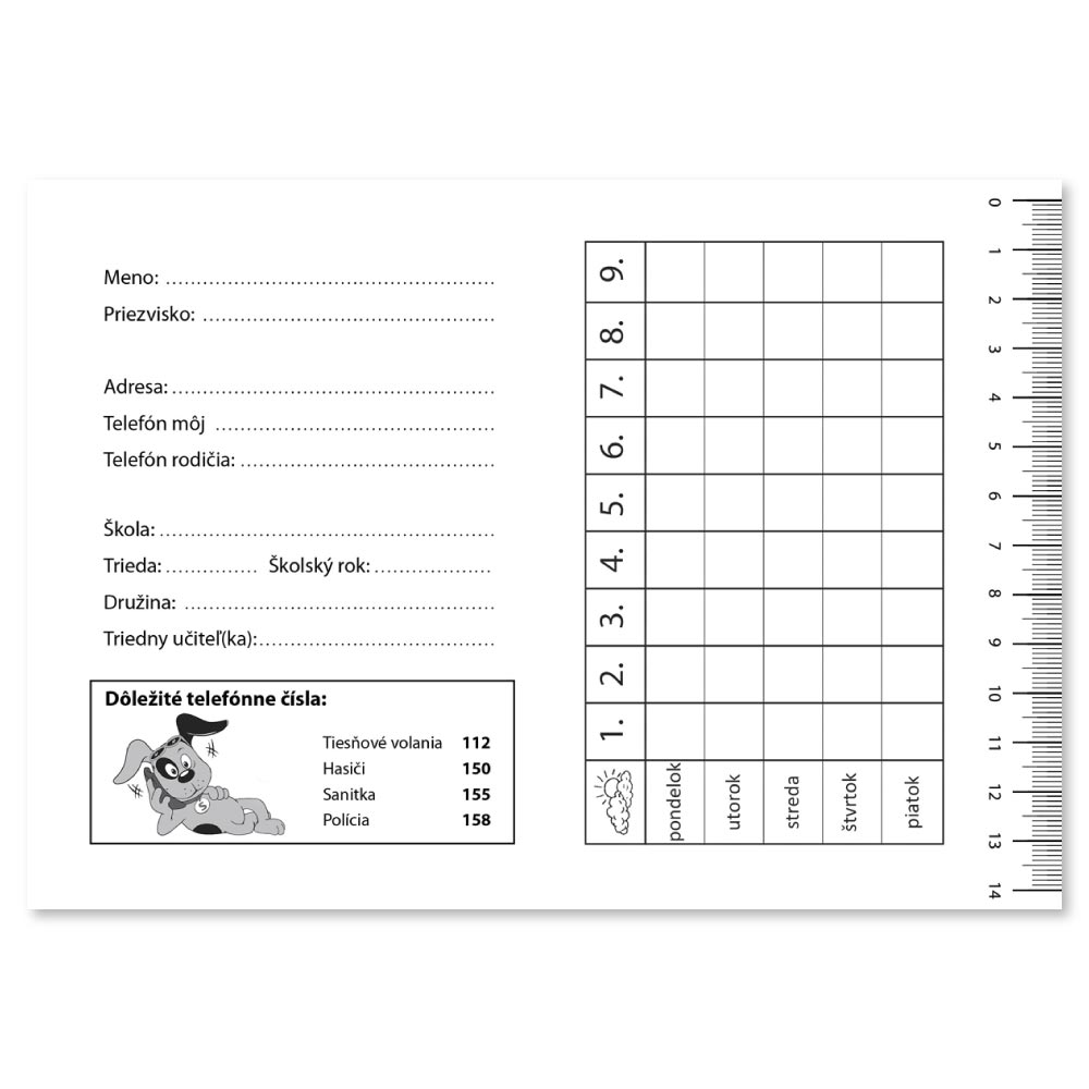 Obsahuje: rozvrh hodín, s možnosťou zapisovania úloh a poznámok