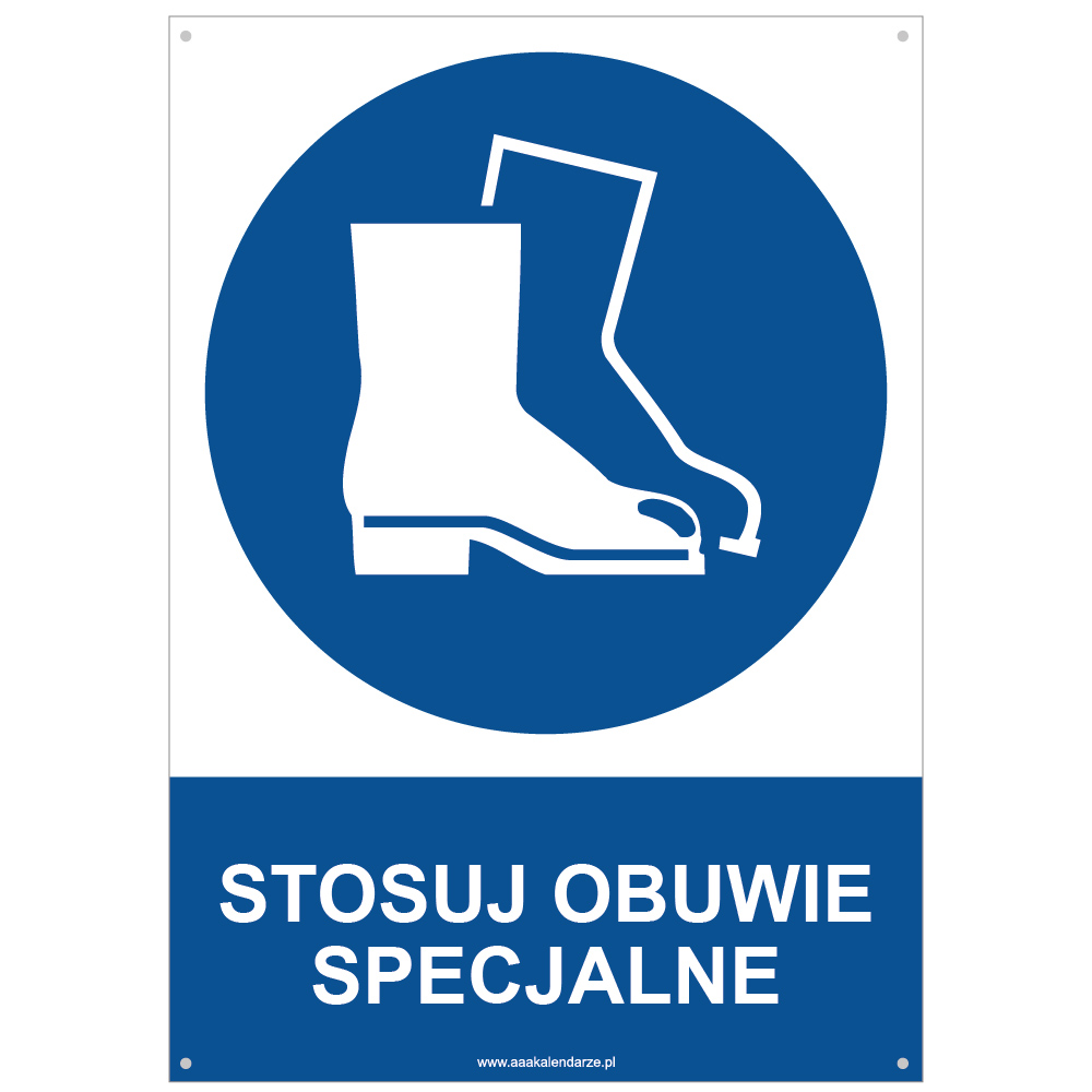 STOSUJ OBUWIE SPECJALNE - znak BHP z dziurkami, płyta PVC A4, 2 mm