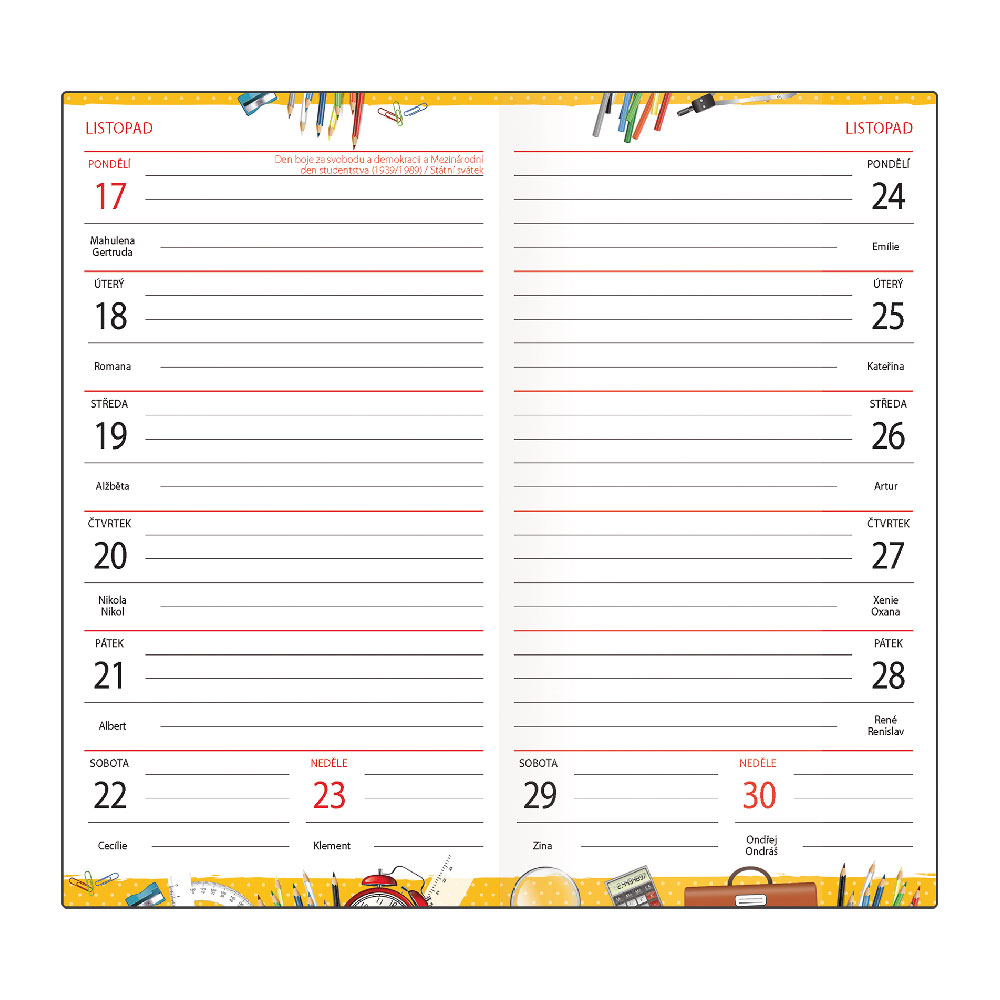 Obsahuje: rozvrh hodín, pravítko, adresár,