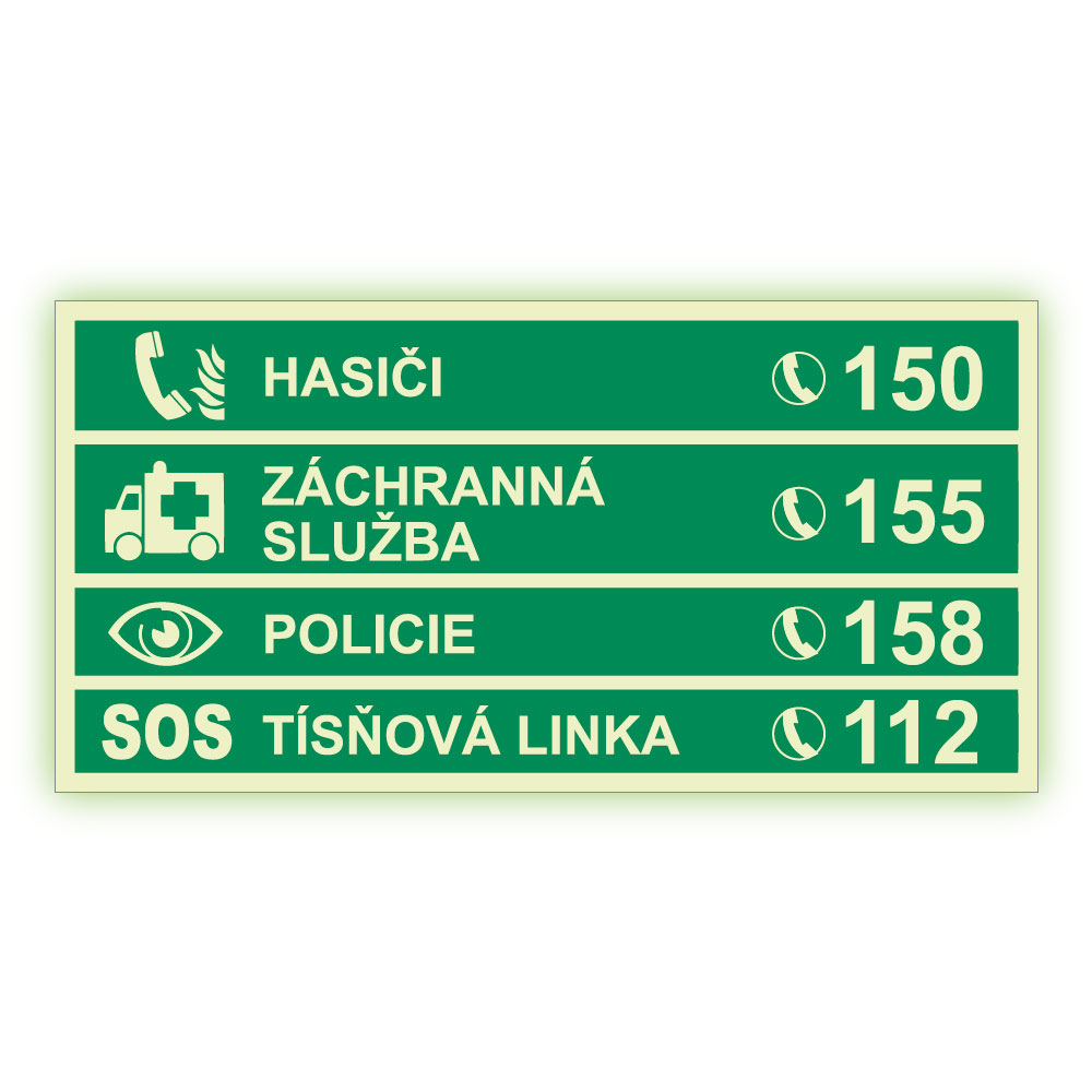 Tísňová telefonní čísla - fotoluminiscenční tabulka, samolepka 300x150 mm