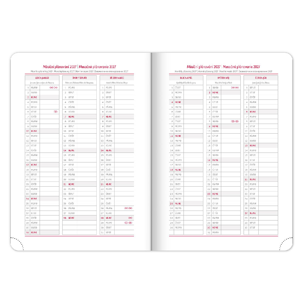 Diár obsahuje: miesto pre osobné údaje, mesačné plánovanie 2026 a 2027,