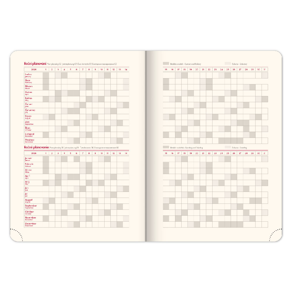Diár obsahuje: miesto pre osobné údaje, mesačné plánovanie 2026 a 2027