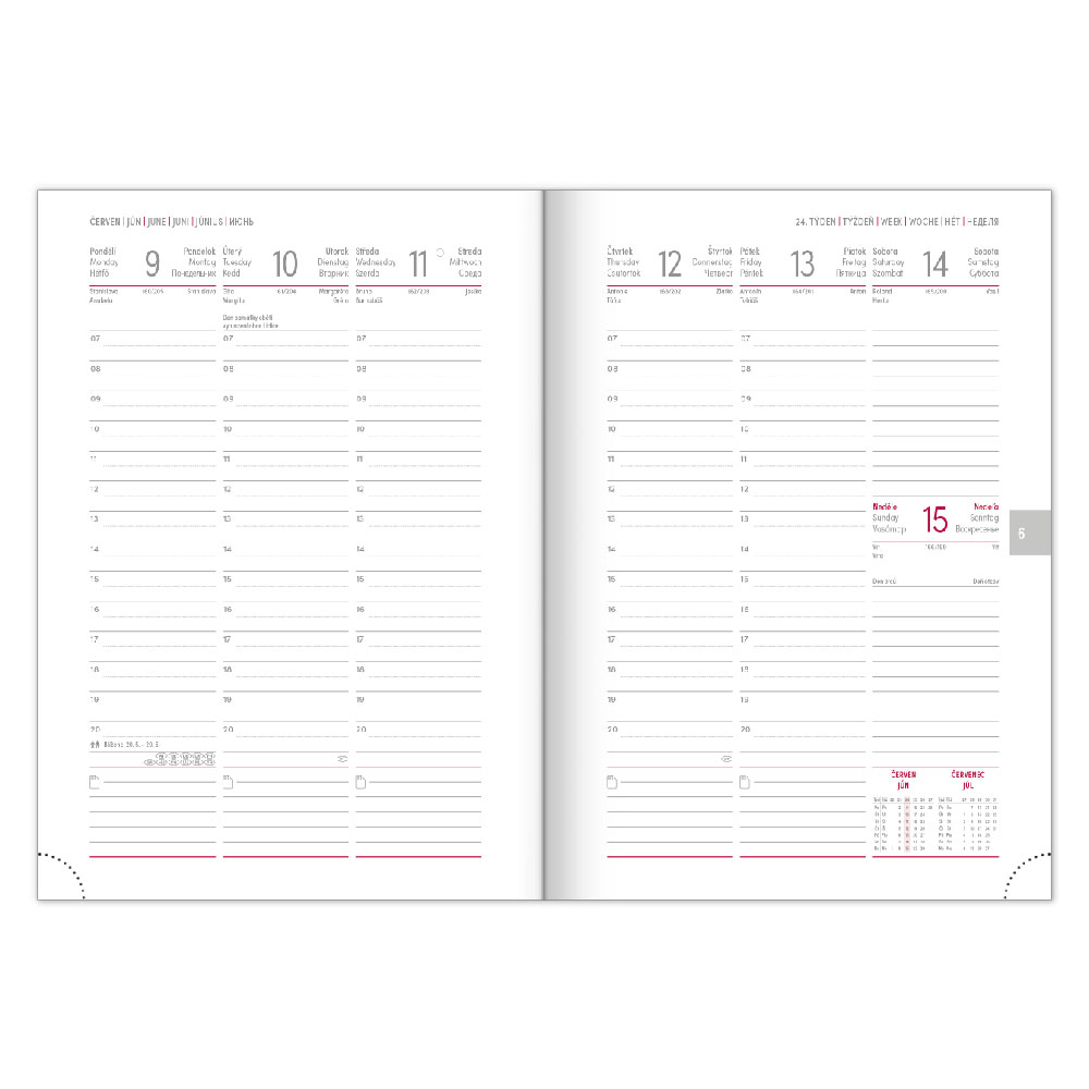 Diár obsahuje: miesto pre osobné údaje, mesačné pláno