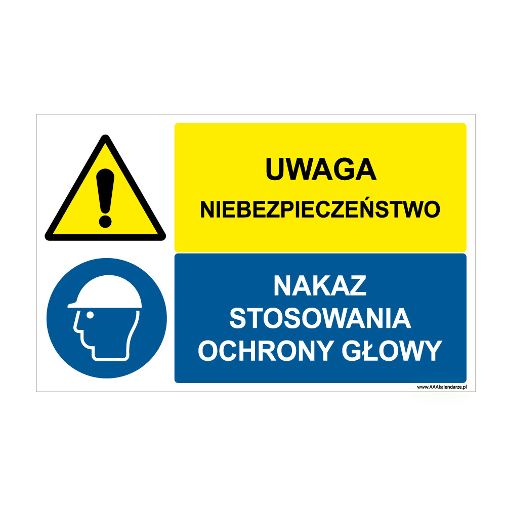 UWAGA NIEBEZPIECZEŃSTWO - NAKAZ STOSOWANIA OCHRONY GŁOWY, ZNAK ŁĄCZONY, płyta PVC 1 mm, 95x60 mm