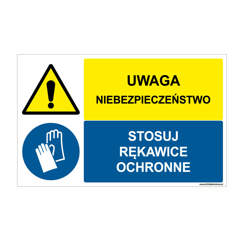 UWAGA NIEBEZPIECZEŃSTWO - STOSUJ RĘKWICE OCHRONNE, ZNAK ŁĄCZONY, naklejka 95x60 mm