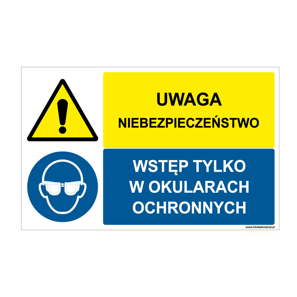UWAGA NIEBEZPIECZEŃSTWO - WSTĘP TYLKO W OKULARACH OCHRONNYCH, ZNAK ŁĄCZONY, naklejka 95x60 mm