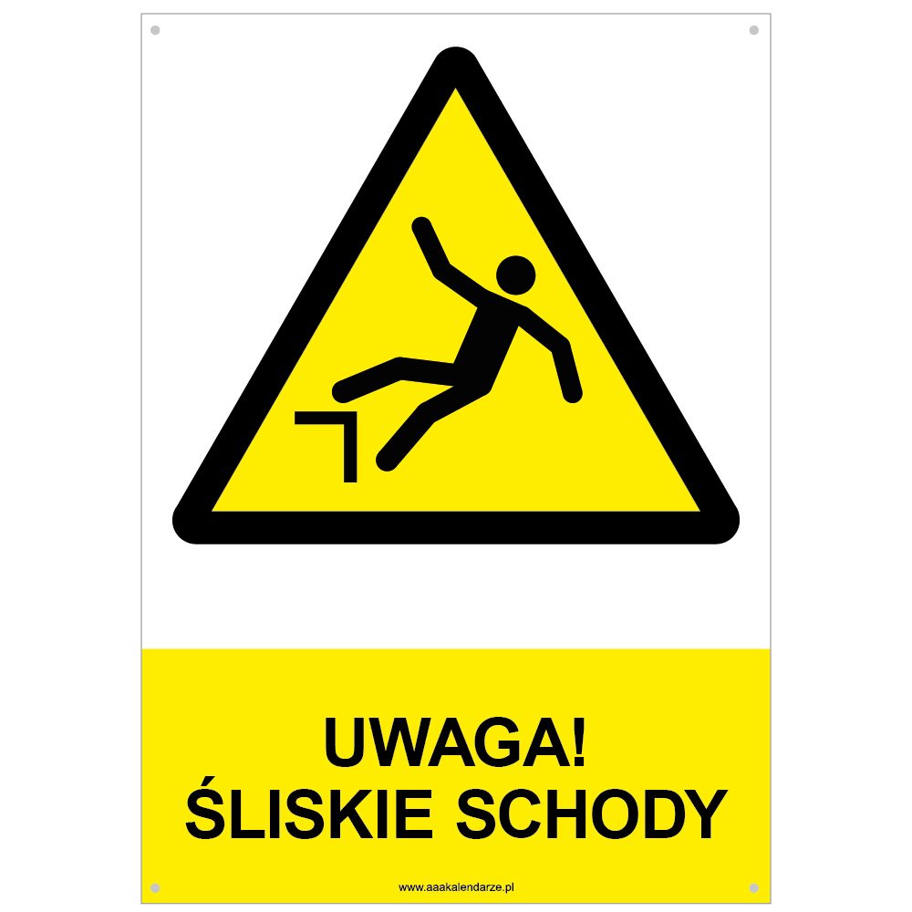 UWAGA! ŚLISKIE SCHODY - znak BHP z dziurkami, płyta PVC A4, 2 mm