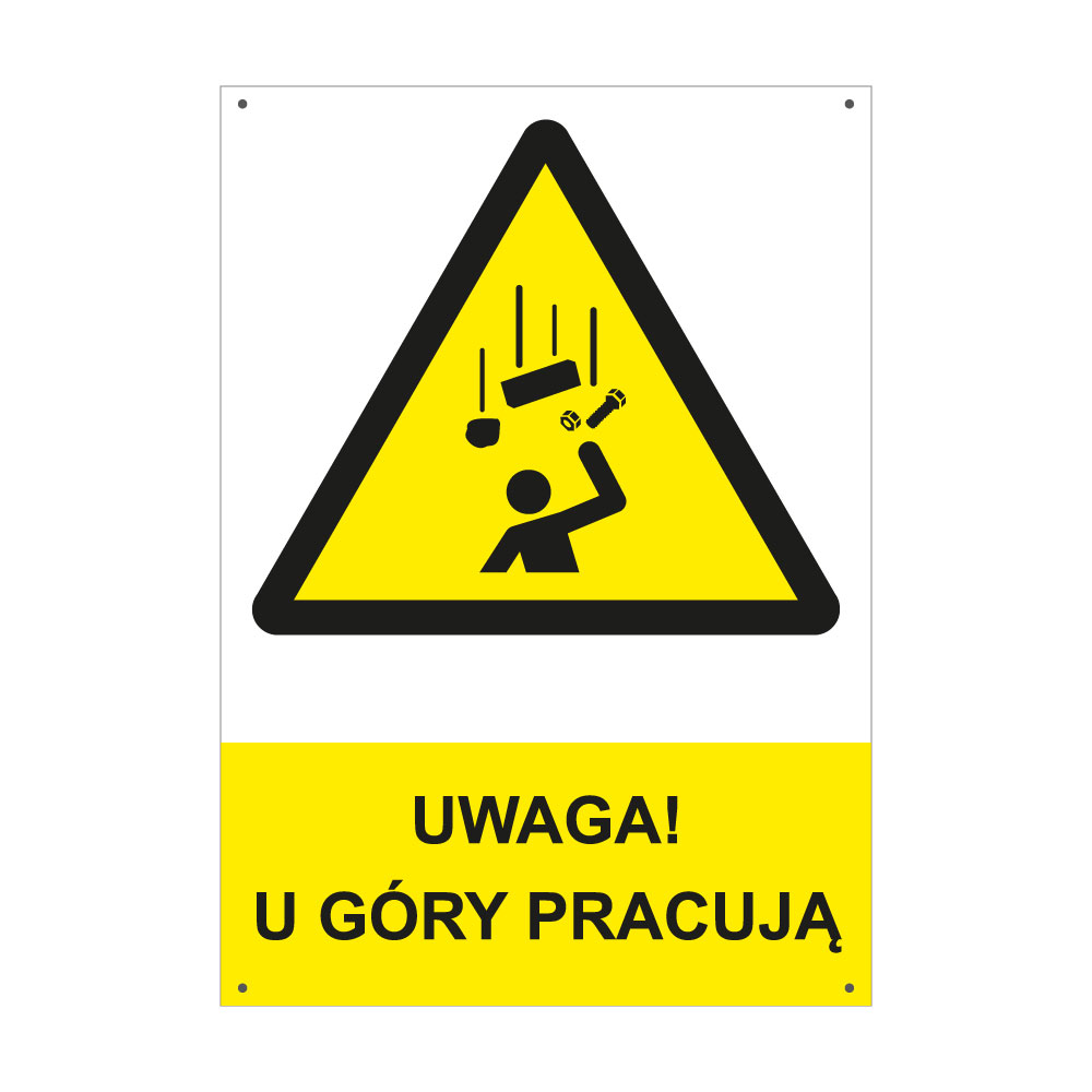 UWAGA! U GÓRY PRACUJĄ - znak BHP z dziurkami, płyta PVC A4, 2 mm