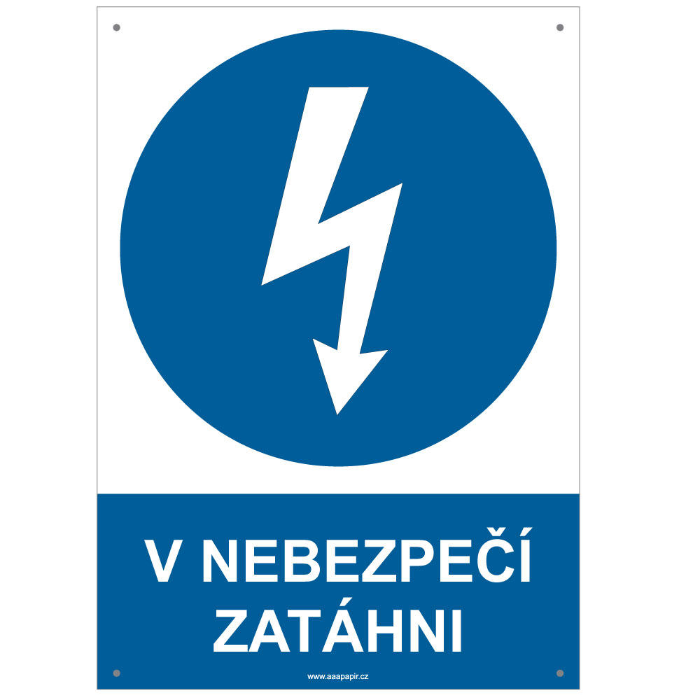 V NEBEZPEČÍ ZATÁHNI - bezpečnostní tabulka s dírkami, plast A4, 2 mm