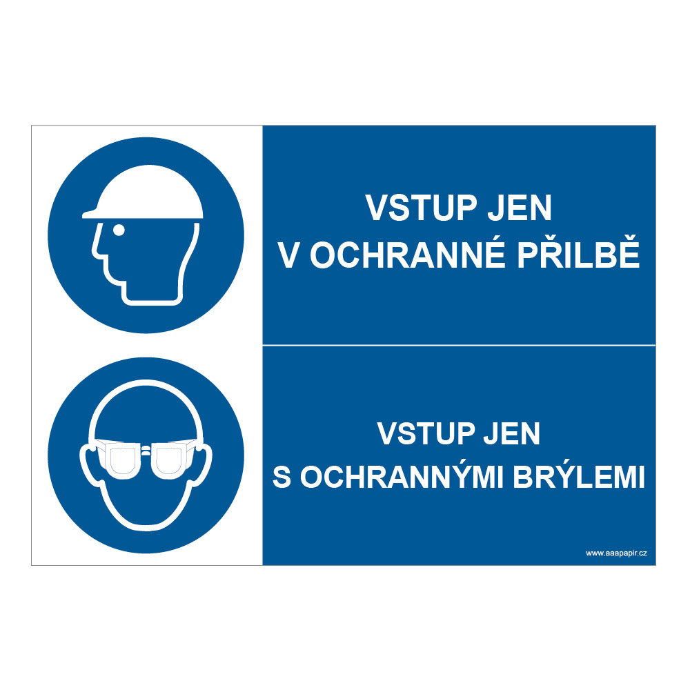 Vstup jen v ochranné přilbě - vstup jen s ochrannými brýlemi, kombinace, samolepka a4