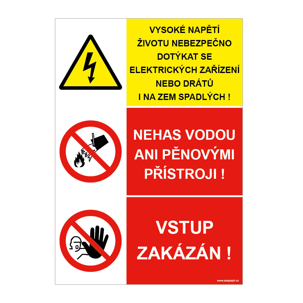Vysoké napětí (dráty)- nehas vodou - vstup zakázán, samolepka a5