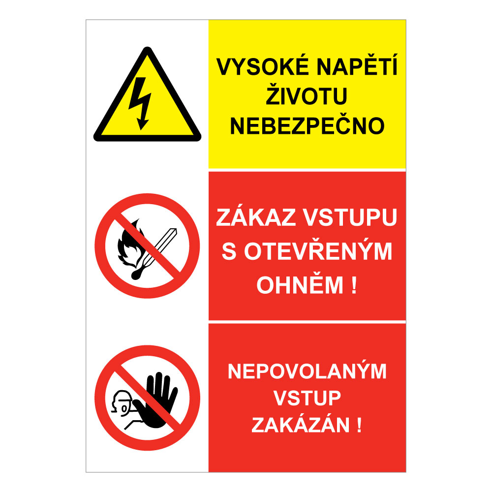 Vysoké napětí životu nebezpečno - zakaz vstupu s otevřenym ohněm - nepovolaným vstup zakázán, samolepka a4