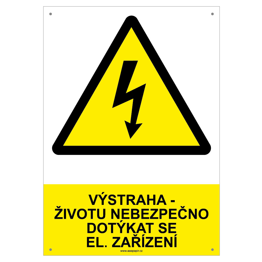 VÝSTRAHA - ŽIVOTU NEBEZPEČNO DOTÝKAT SE EL. ZAŘÍZENÍ - bezpečnostní tabulka s dírkami, plast A4, 2 mm