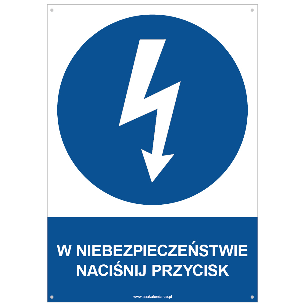 W NIEBEZPIECZEŃSTWIE NACIŚNIJ PRZYCISK - znak BHP z dziurkami, płyta PVC A4, 2 mm