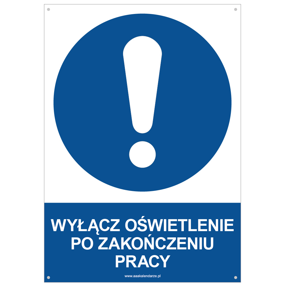 WYŁĄCZ OŚWIETLENIE PO ZAKOŃCZENIU PRACY - znak BHP z dziurkami, płyta PVC A4, 2 mm