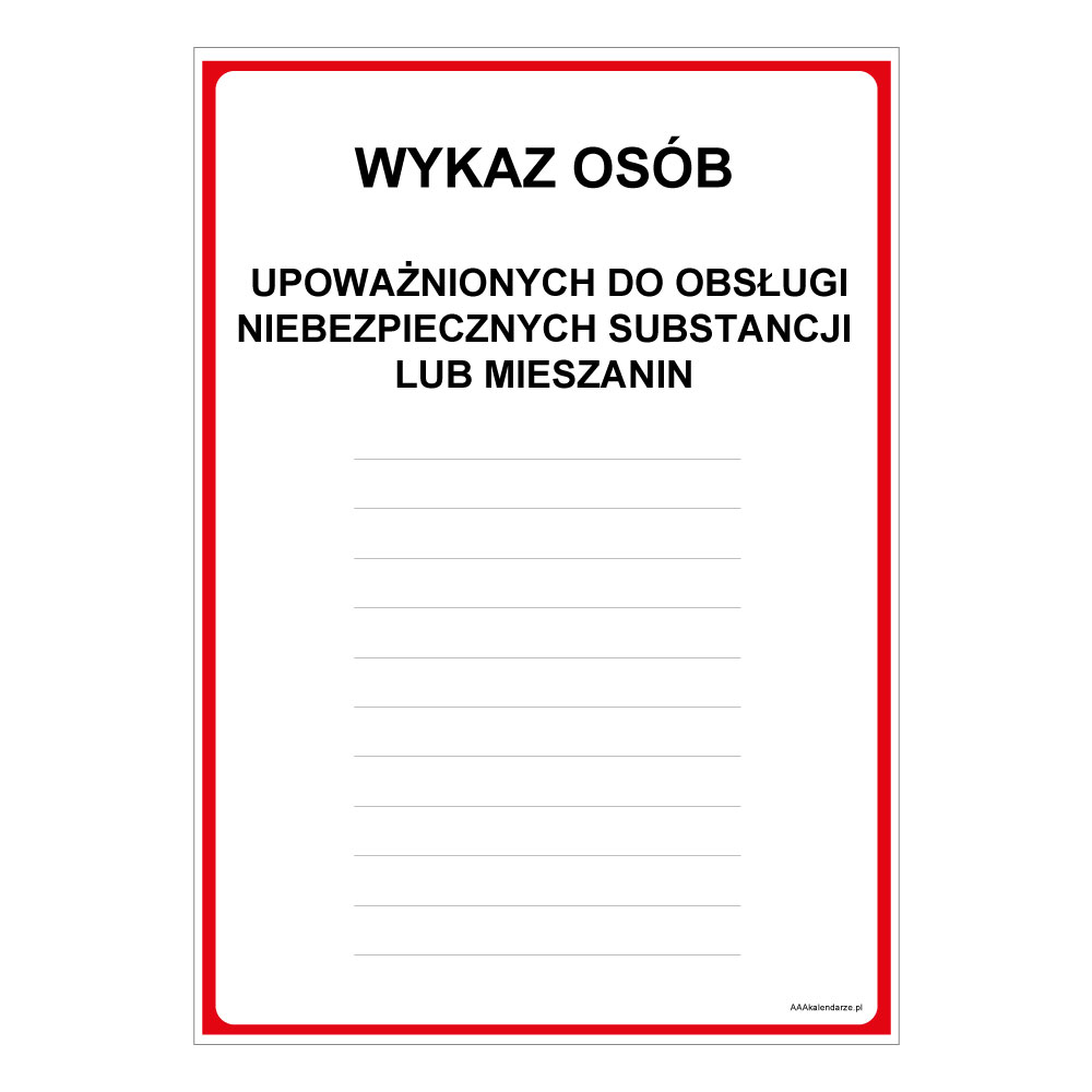 WYKAZ OSÓB UPOWAŻNIONYCH DO OBSŁUGI NIEBEZPIECZNYCH SUBSTANCJI LUB MIESZANIN, naklejka 210x297 mm