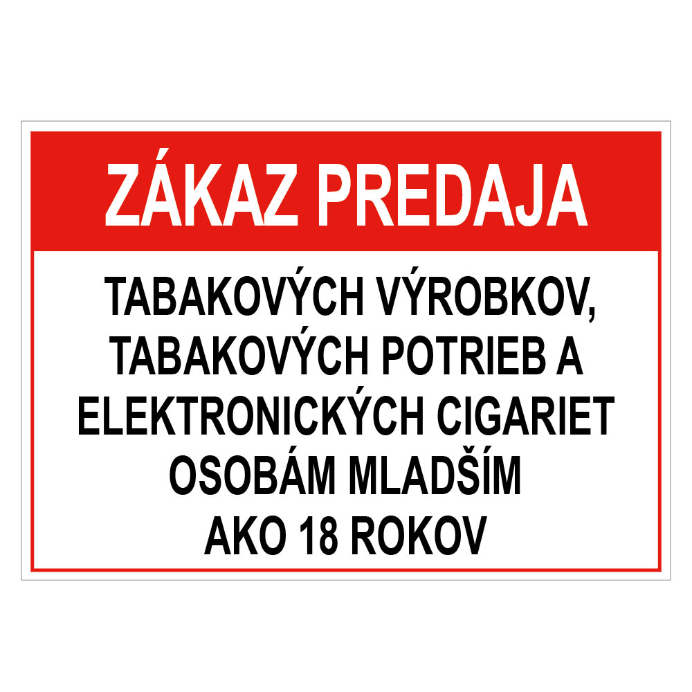Zákaz predaja tab. výr., potrieb a el. cigariet osobám mladším 18 - bezpečnostná tabuľka, plast 0,5 mm, 75x150 mm
