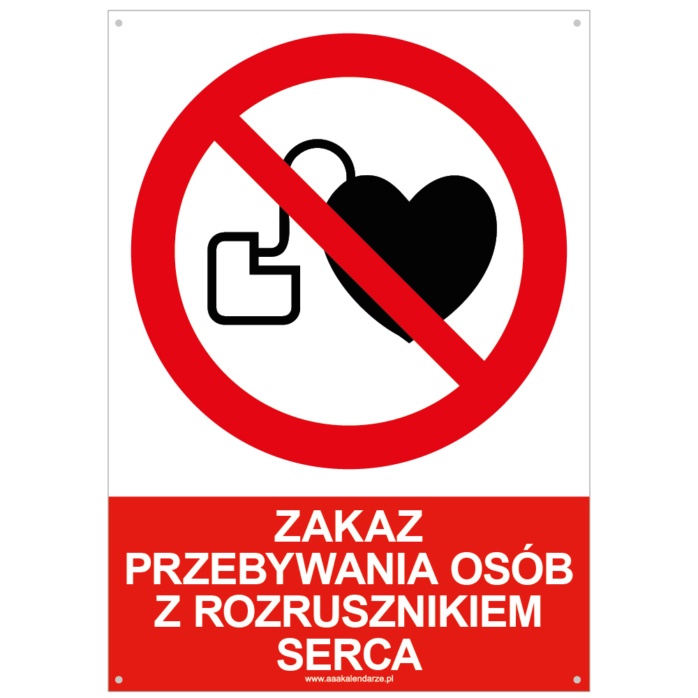 ZAKAZ PRZEBYWANIA OSÓB Z ROZRUSZNIKIEM SERCA - znak BHP z dziurkami, płyta PVC A4, 2 mm