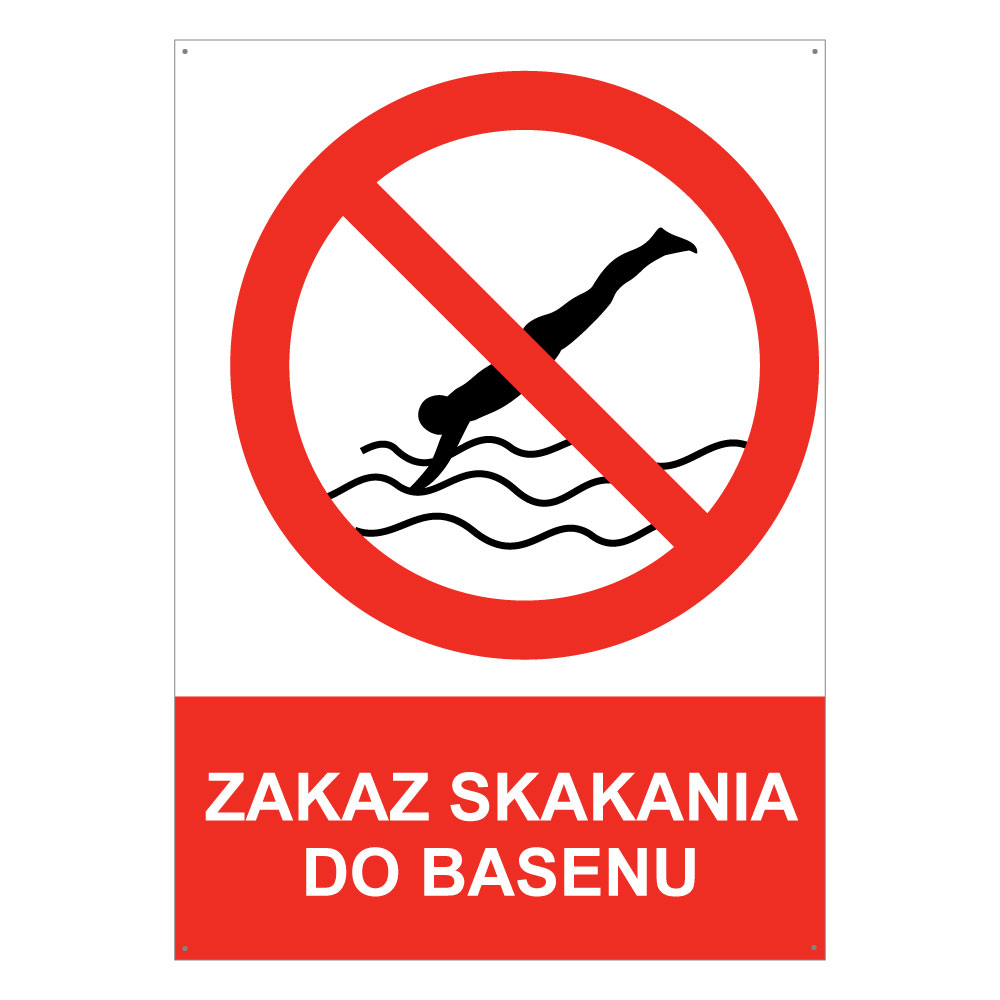 ZAKAZ SKAKANIA DO BASENU - znak BHP z dziurkami, płyta PVC A4, 2 mm