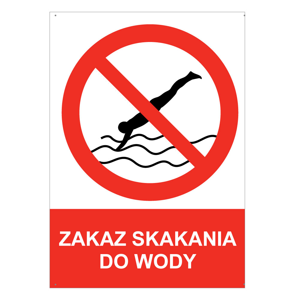 ZAKAZ SKAKANIA DO WODY - znak BHP z dziurkami, płyta PVC A4, 2 mm