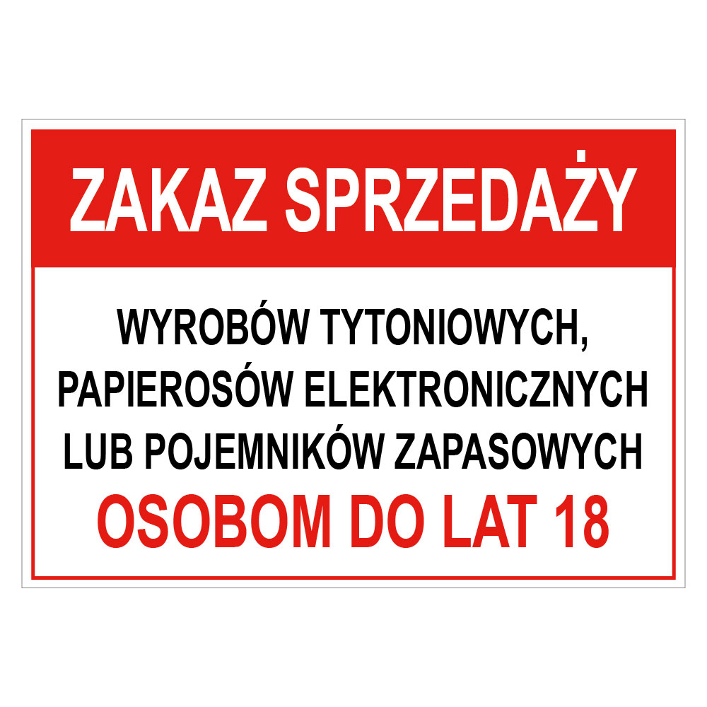 Zakaz sprzedaży w. tytoniowych, papierosów el. lub poj. zap. os. do lat 18 - znak BHP, naklejka A4