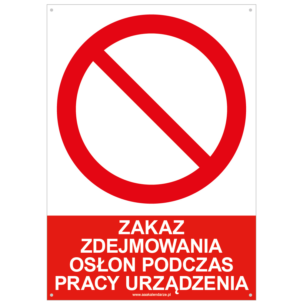 ZAKAZ ZDEJMOWANIA OSŁON PODCZAS PRACY URZĄDZENIA - znak BHP z dziurkami, płyta PVC A4, 2 mm